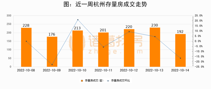从存量房来看,2022年10月14日杭州存量房单日成交192套,比昨日减少38套,环比下降16.5%。从近一周存量房成交来看,杭州存量房日均成交套数为208套,其中10月13日成交量较高为230套,10月14日单日成交192套,低于近一周平均水平7.7%。