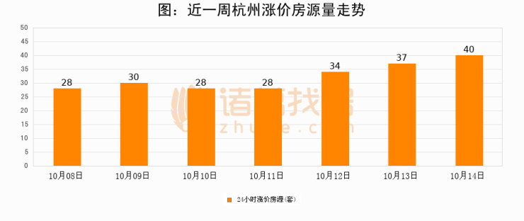 根据诸葛找房数据显示,杭州24小时涨价房源量为40套,较10月13日增加3套,环比上涨8.1%。与此同时,涨价房源占比小幅扩大,业主信心有所提升。