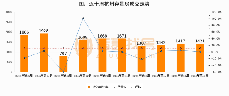 存量房方面,第25周杭州存量房成交1421套,较上周增加4套,环比上涨0.3%。从近十周成交走势来看,周均成交套数为1502套,本周低于平均水平5.4%。