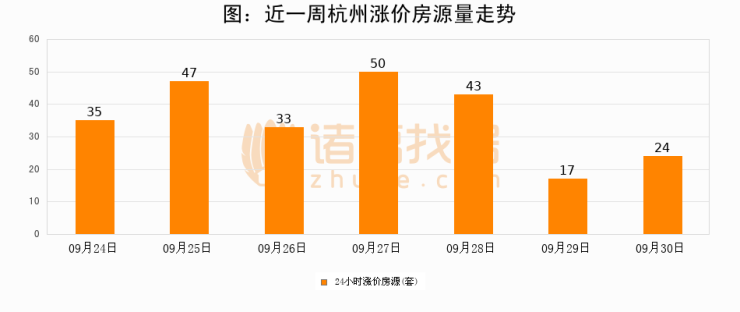 根据诸葛找房数据显示,杭州24小时涨价房源量为24套,较09月29日增加7套,环比上涨41.2%。与此同时,涨价房源占比小幅扩大,业主信心有所提升。