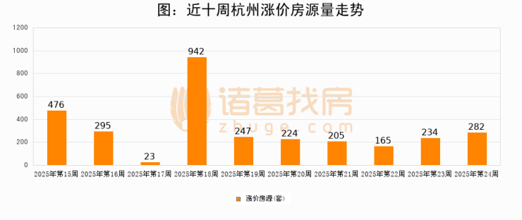 从调价房源来看,第24周杭州涨价房源282套,较上周上涨20.5%。与此同时,24周涨价房源占比提升0.06个百分点,业主信心持续恢复。
