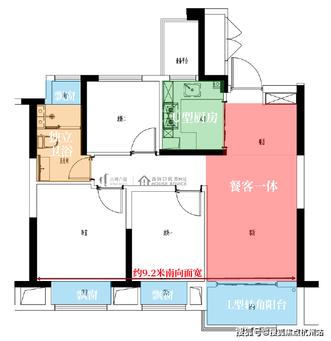 约88㎡户型格局方正,三开间朝南,约3.2米南向面宽。三房设计尺度适宜,赠送3个飘窗面积。L型转角阳台增加室内采光,餐客一体,U型厨房预留冰箱位。总体而言是一个应有尽有十分精致的户型。