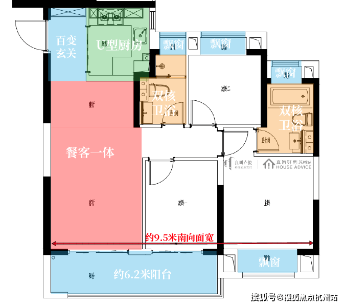 约98㎡户型与88㎡户型相比,多了一个卫生间,为三房两厅两卫设计。进门处百变玄关增加收纳空间,U型厨房设计功能分区明确,主卧卫生间带浴缸。南向约9.5米面宽,L型转角双联阳台尺度达6.2米,居住应该十分舒适。