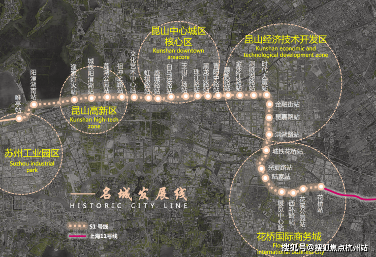 城市发展,交通先行。上海地铁11号线加速了花桥上海两地连接;沪宁高速、312国道、上海绕城高速、地铁S1号线(建设中)交汇……同城化深入发展,承接着更多上海的外溢需求。