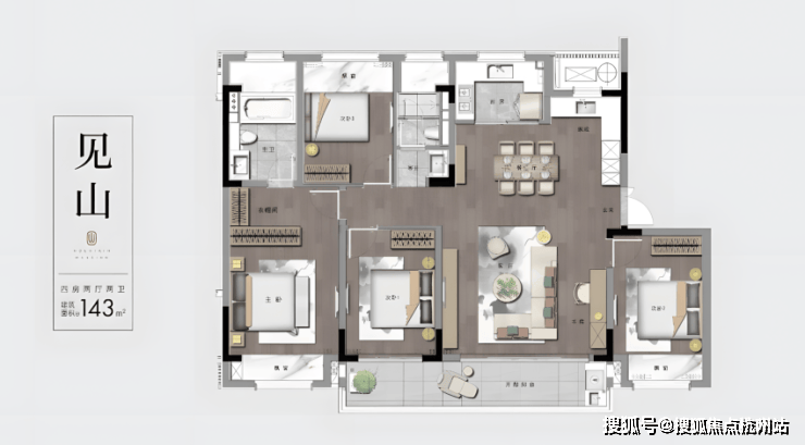 主力户型均配置双阳台系统——南向景观阳台连接自然,并搭配全景飘窗设计,极大提升采光面与视觉通透感。例如建筑面积约143平方米的户型,实现了四开间朝南,5.3米宽厅连接阳台,引景入室,光明盈户。