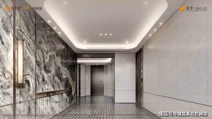 入户大堂:大面璀璨星河奢石、高山流水地砖、通高门头电梯、弧角叠级吊顶等叠加,超12万项目才会有的配置。
