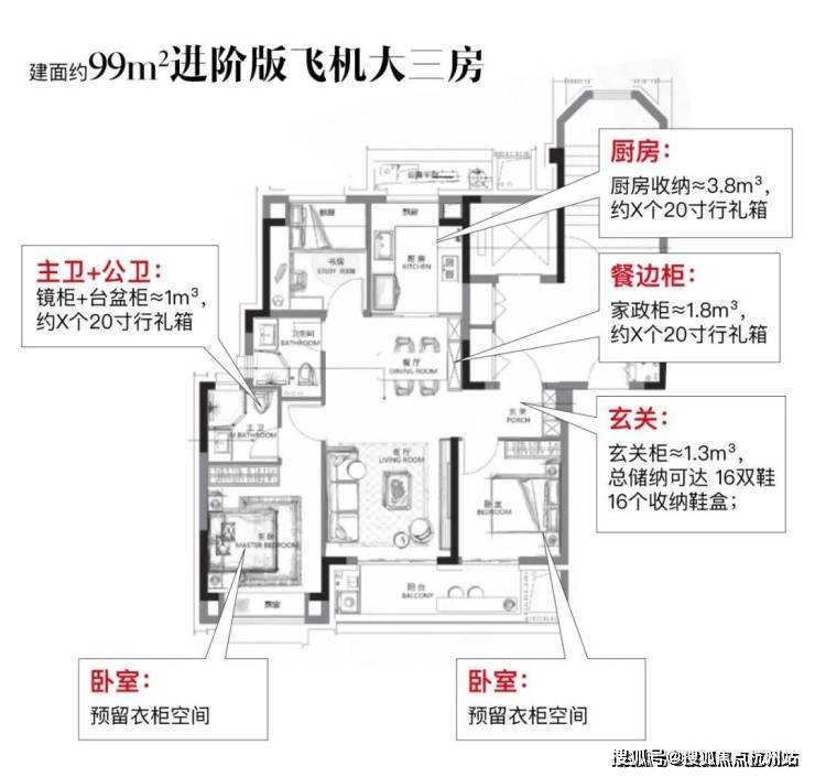 主力建面约99㎡3房产品,非常标准的南北通透飞机户型,整个室内几乎无走道,空间0浪费。