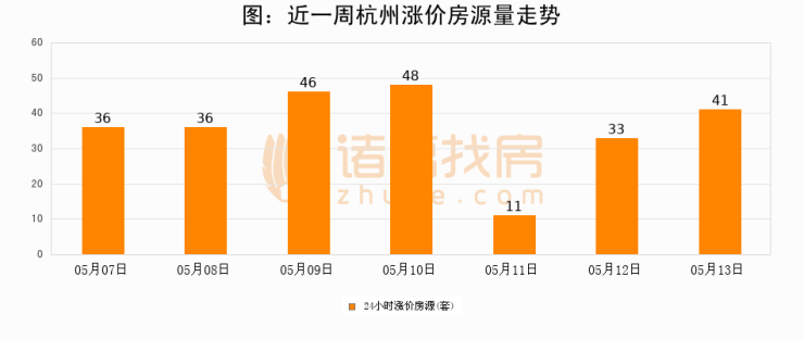 根据诸葛找房数据显示,杭州24小时涨价房源量为41套,较05月12日增加8套,环比上涨24.2%。与此同时,涨价房源占比小幅扩大,业主信心有所提升。