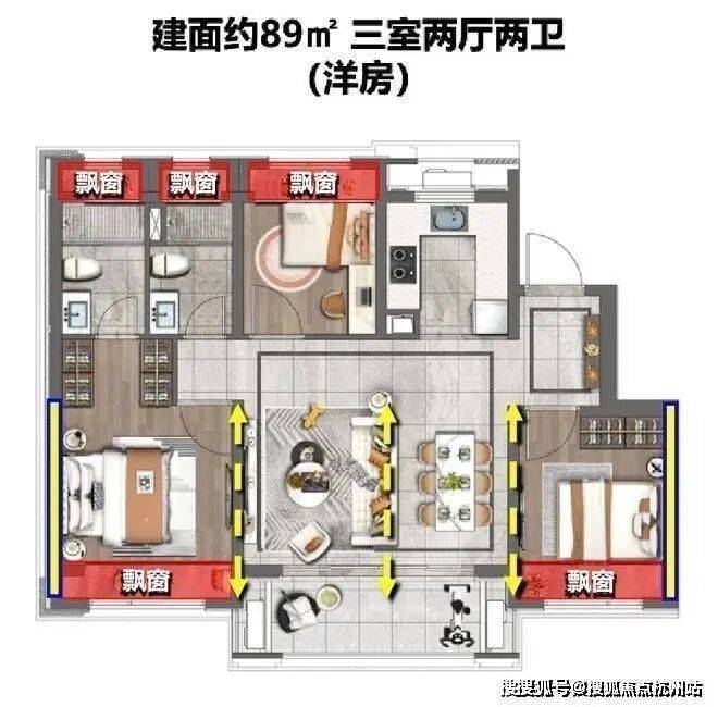 建面约89㎡(三房两厅两卫)