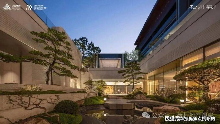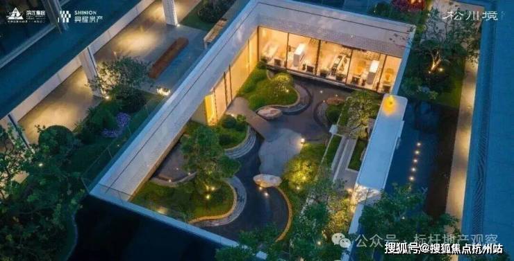 约3300平方米的中央景观,下沉式庭院与双水院景观错落有致,将《松阁观潮图》、《溪山行旅图》、《山亭文会图》三幅宋代古画,巧妙融入松川境的立体山水之中。高层与排屋区之间,一条长约210米的中轴景观横贯东西,串联起「松川十一境」的雅致画卷。该项目景观设计由北京顺景园林执笔。
