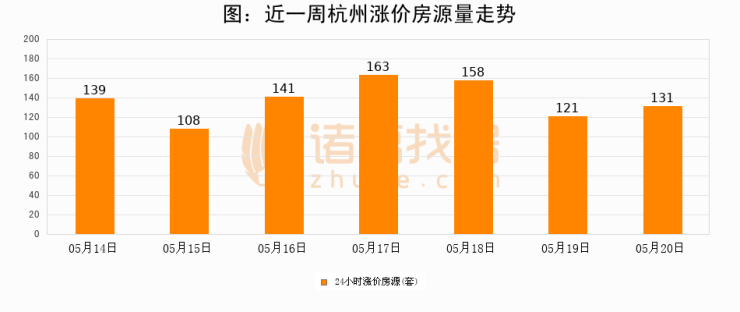 根据诸葛找房数据显示,杭州24小时涨价房源量为131套,较05月19日增加10套,环比上涨8.3%。与此同时,涨价房源占比小幅扩大,业主信心有所提升。
