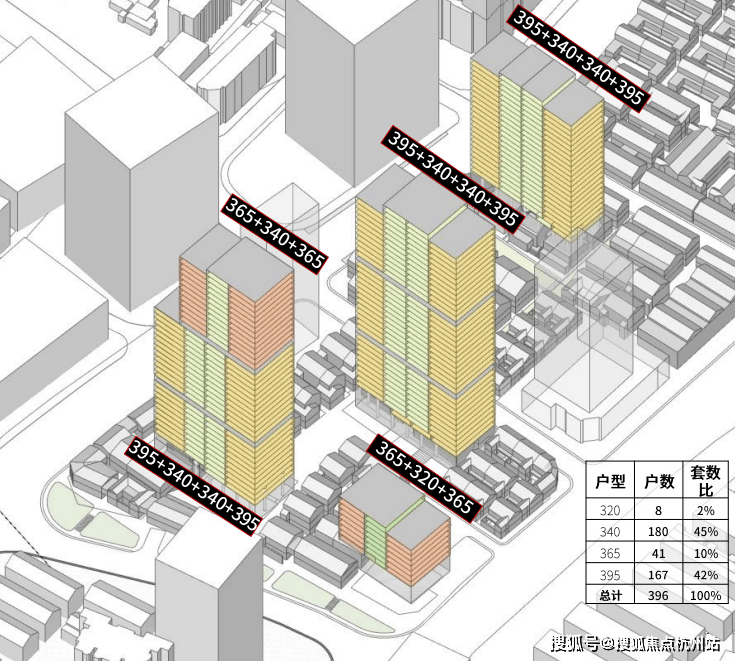 最小户型320平均位于西南角的9F洋房中,套数仅8套,其余则为340、365以及395的塔楼户型!