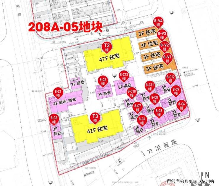 南区208A-05地块为Rr3类住宅、商业混合用地,拟建1幢170米47F层超高层住宅、1幢150米41F超高层住宅、4幢3层风貌别墅以及14栋2-4F商业。