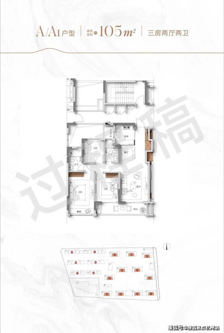 建面约105方三房两厅两卫户型: