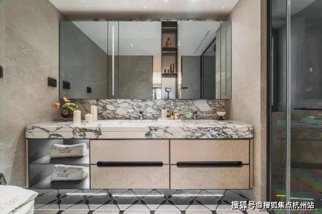 在豪宅的配置之外,精装细节亦追求极致:公共区域选用80×80cm的大理石通铺,以整面石材的厚重质感彰显空间格调,同时采用无缝拼接工艺,显著降低了日常清洁的难度。