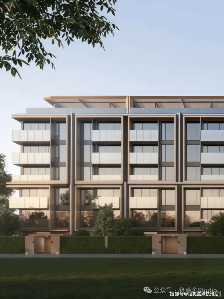 低密叠墅选用定制级香槟金铝板,搭配大面积落地窗与金色窗框,宛如一幅幅镶金边的油画,呈现极致华丽的居住美学。