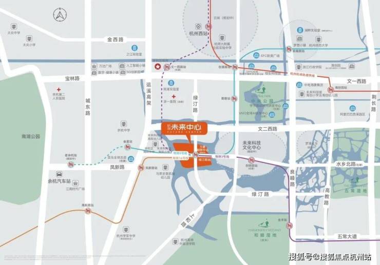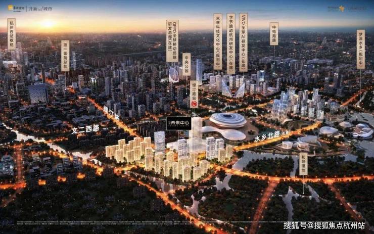 项目东侧规划未来科技文化中心,是辐射城西乃至整个杭州的新一代城市公共中心。包括国际体育中心、综合文化中心(“五馆一中心”)等。