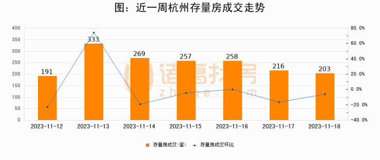 从存量房来看,2023年11月18日杭州存量房单日成交203套,比昨日减少13套,环比下降6%。从近一周存量房成交来看,杭州存量房日均成交套数为246套,11月18日单日成交203套,低于近一周平均水平17.5%。