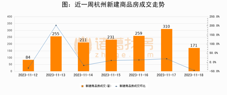 根据杭州市住房保障和房产管理局数据显示,2023年11月18日杭州新建商品房成交171套,较昨日减少139套,环比下降44.8%