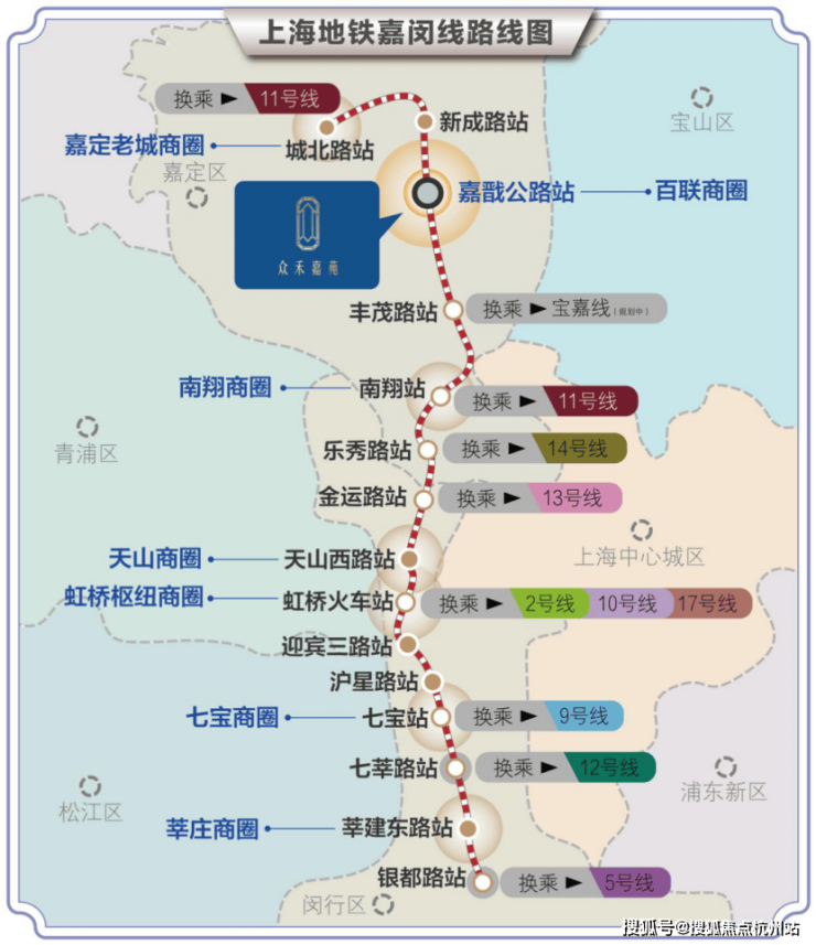 距众禾嘉苑仅一站的 丰茂路站, 即为一主二辅枢纽体系中的嘉定东枢纽,是嘉闵线、宝嘉线的换乘站,可 为新城提供直达苏锡常的大容量、高可靠公共交通服务,是嘉定新城最具潜力的核心引擎。