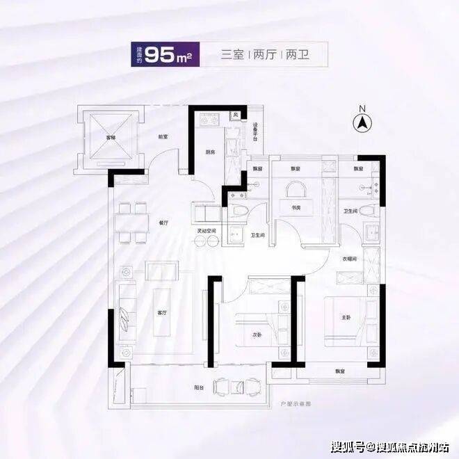 建面约95、96㎡室内拥有双开间大尺度阳台、全屋四处飘窗、套房式主卧,舒适度颇高。