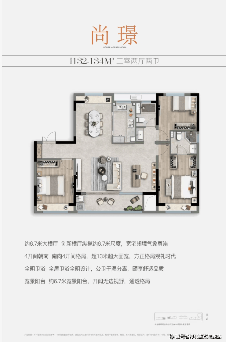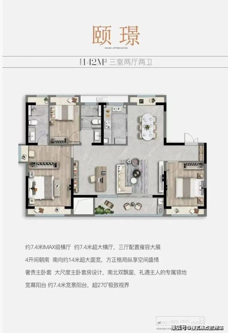 户型点评:百平左右的户型打造三室很常见,但能同时做到南向3.5开间属实难得;餐客横厅更是达到了约5.1米的宽度设计,大幅提升了生活舒适度、以及实用性;主卧套房,涵盖步入式衣帽间与独立卫浴,南向自带飘窗,缔造尊贵私密私享。