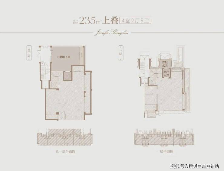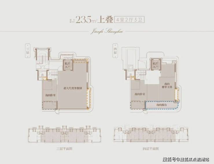 建面约235㎡上叠,则为三代同堂的家庭提供了解决方案。北向首层私享建面约25㎡的入户花园;上叠三层以无界厅堂为核心,约10.4米开间让光线无遮挡漫入;上叠四层三间卧室均朝南,实现全明采光;与市场常规上叠不同,建发海宸上叠拥有建面约80㎡地下空间(双层)与建面约50㎡私家阁楼,真正实现“空间超越面积”的价值升华。