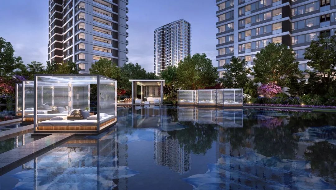 景观灵感源自克劳德·莫奈的《睡莲》系列,提取光影、如镜、色彩融入园林之中,同时汲取莫奈故居“水园”与“花园”双重景观规划,取其形,减其形,以化繁为简的现代设计手法在繁华之中深入居者内心。