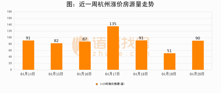 根据诸葛找房数据显示,杭州24小时涨价房源量为90套,较04月19日增加39套,环比上涨76.5%。与此同时,涨价房源占比小幅扩大,业主信心有所提升。