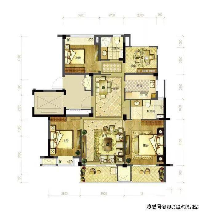 像这样的4室户型是不得多见的,三开间朝南,并且客厅和主卧都有大阳台,略显尴尬的是北面卫生间的位置,一般会放在边角中。112方能做到4室,高层是不可能了,体现了小高层不可多得的高得房率。