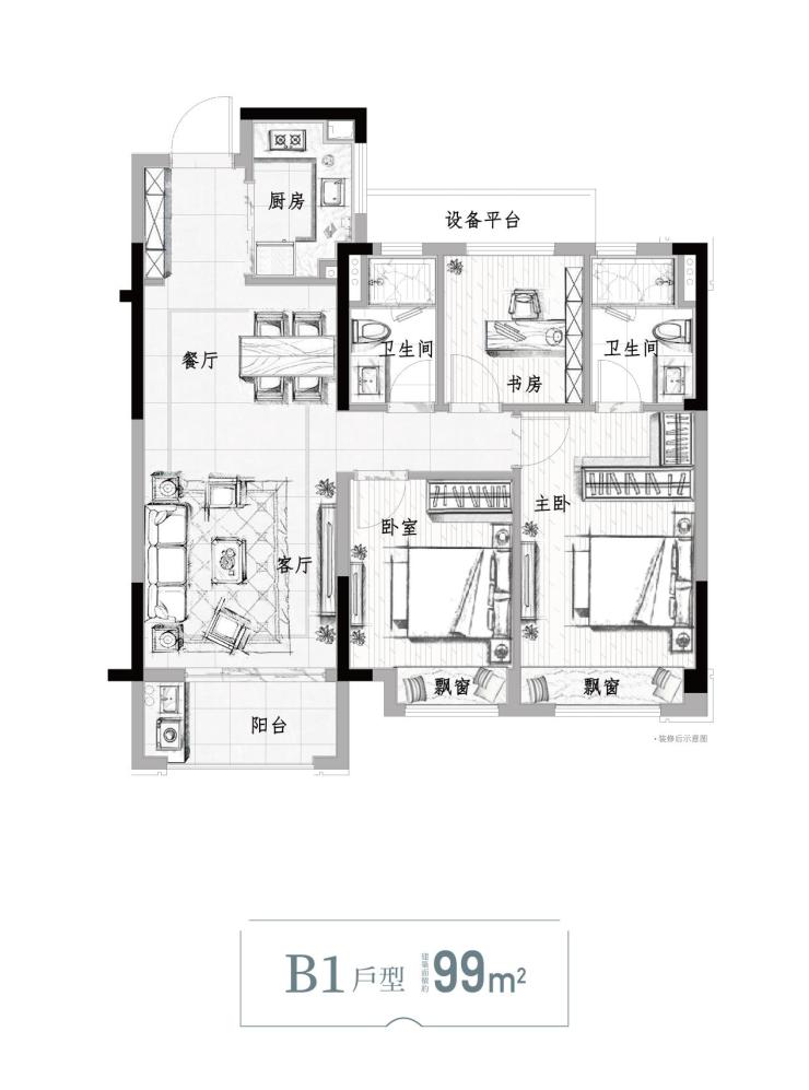 星合映99方户型(建面约)餐客厅一体化,附带约6米的宽境窗台;主次卧皆朝南,主卧套房设计,享全明独立卫浴,次卧连接观景阳台……妥妥的全能户型。