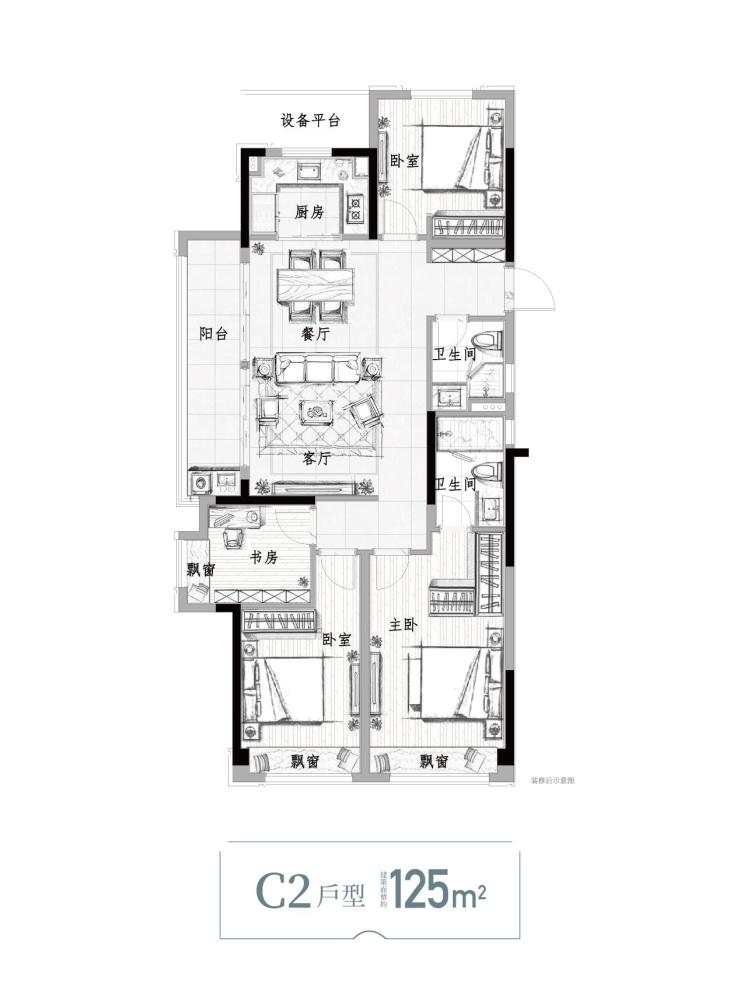星合映125方大四房(建面约),在遵循“阳光优先”的生活理念下,南向面宽约10.5米,三开间齐齐朝南,向阳而生的场景处处可见。长度约7米的阔景阳台,横跨客厅与南向卧室,不仅提升空间的使用率,更为休憩与居家运动留得“余地”。
