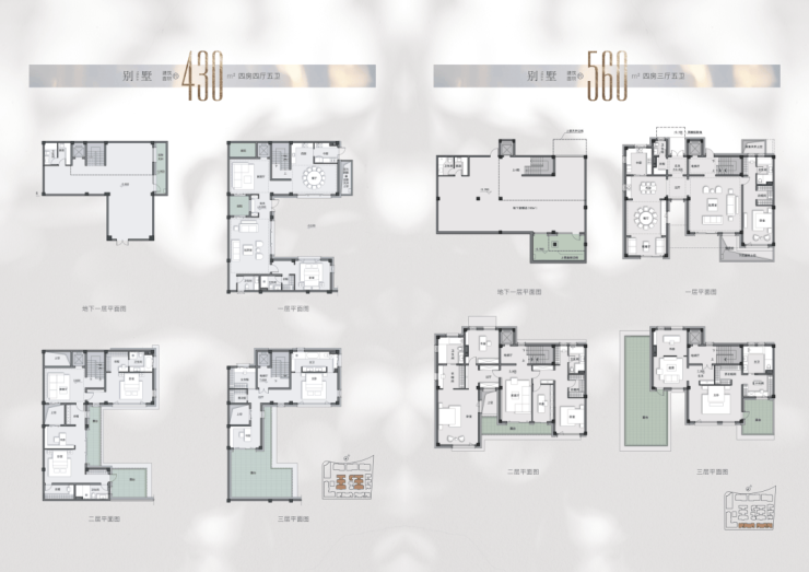 别墅是大头,且都是拼接型别墅:地上三层,地下一层, 从430㎡、560㎡、690㎡三种,都是四房四厅五卫的设计。