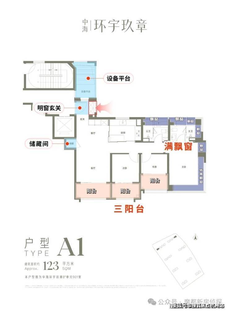 它通过精心设计的南向三个阳台和全屋的飘窗,巧妙地多出了约几十平的面积。这意味着,你花的123㎡的钱,享受的是接近140㎡左右的居住体验。