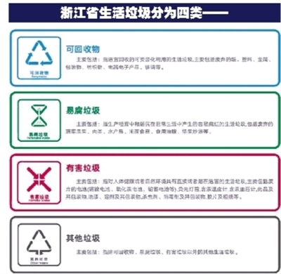 条例明确,和杭州现在实施的一样,今后,全省生活垃圾分为可回收物、有害垃圾、易腐垃圾、其他垃圾四类,住宅小区、农村、有关场所应按照规定分别设置相应生活垃圾收集容器。