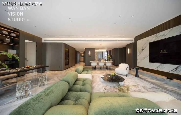 客厅背景墙更像是一场世界顶级石材展览,西边套用的是巴西进口石材天宝石,高贵中带着优雅;东边套用的是意大利卡拉拉大理石中的顶级「雕刻白」系列,我们熟知的世界著名雕塑《大卫》雕塑、世界著名建筑比萨斜塔等等,用的就是这一种石材。