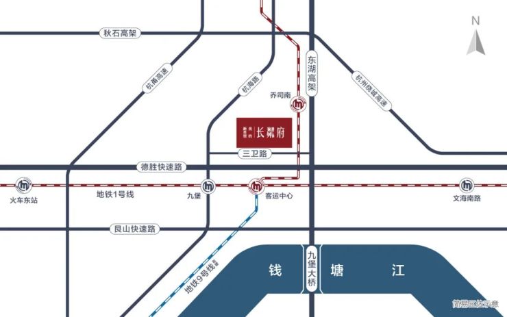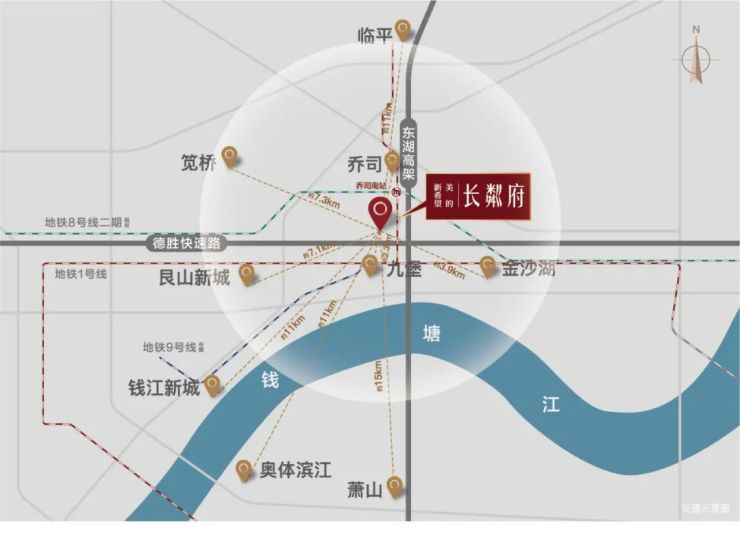 直线约700米处,即是地铁1号线乔司南站,与在建地铁9号线客运中心站直线距离约1公里,双地铁加持。未来10站可达武林广场、3站钱江新城二期、7站江河汇,到万象城也仅仅只需要9站!