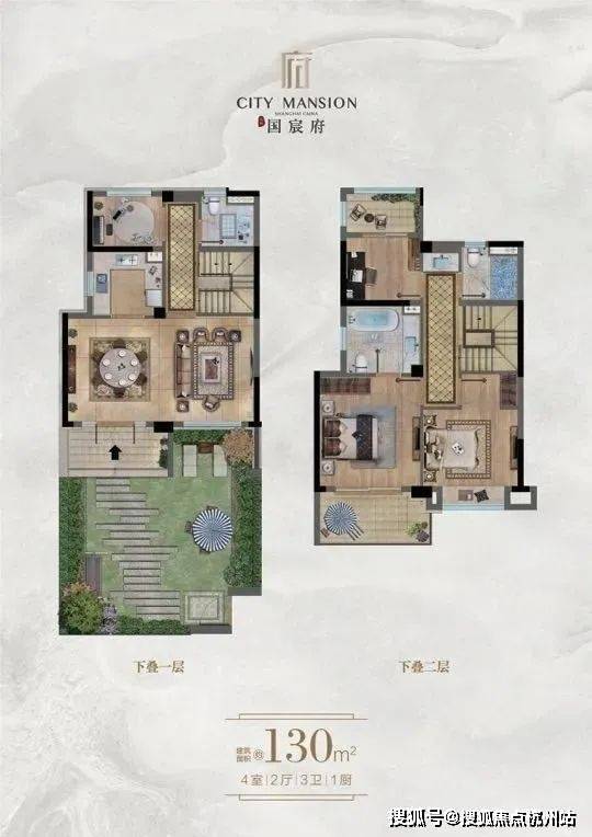 下叠: 1-2层 130平,有花园和地下室