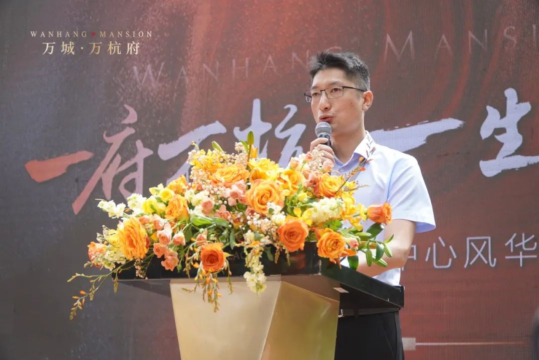 在一曲动感的开场舞后,主持人宣布“一府万杭 一生骄傲”万城·万杭府展示中心开放仪式正式开始。尊荣时刻,掌声四起,浙江万城实业集团有限公司副总经理任永生先生致辞,欢迎嘉宾们的莅临,并向每一位关心万杭府进程的宾客们解读项目的进展情况、产品亮特点,以及园区、户型相关的规划设计等,表示“万城·万杭府定将不负期待,为杭海新城再次开创人居新篇章”。