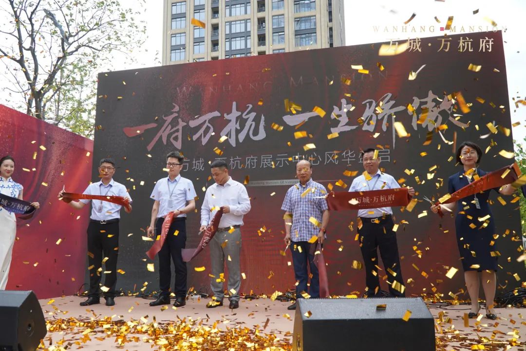 在激昂的音乐声中,浙江万城实业集团董事长朱静江、浙江侨福置业有限公司总经理张永生、万城总经理朱建明、常务副总经理贝凌峰、副总经理任永生以及营销副总监王凌娟在主持人的邀请下,一起上台为万城·万杭府“一府万杭 一生骄傲”展示中心开放正式剪彩,礼炮齐鸣,掌声雷动,一城仰止的融杭生活就此启航。