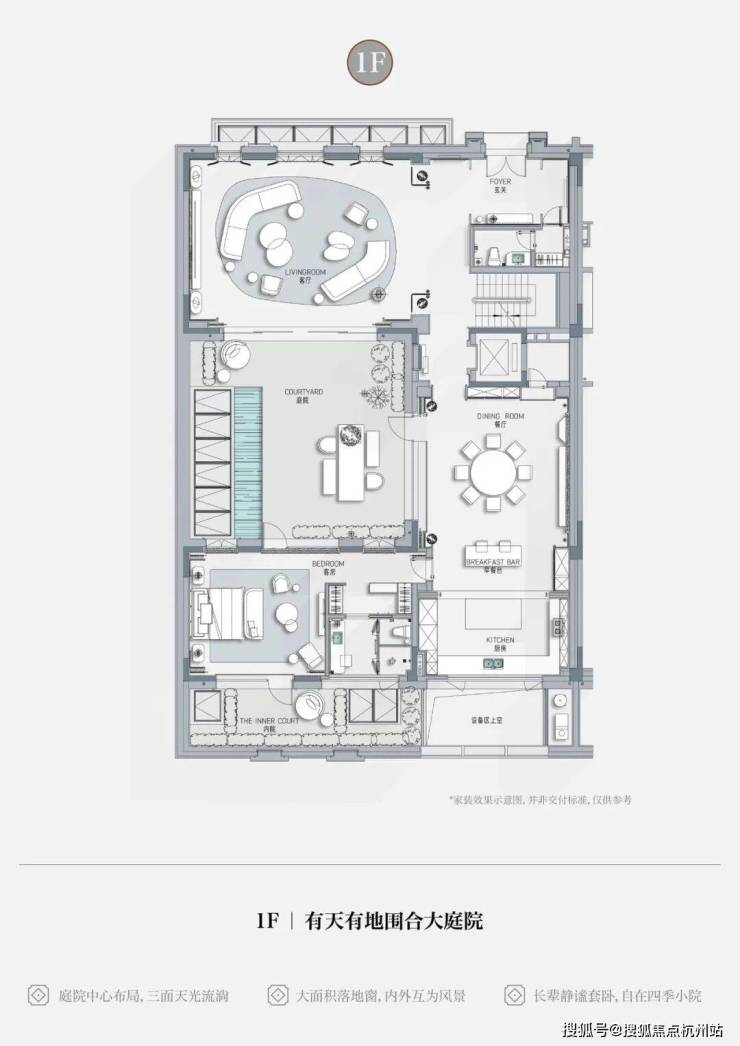 庭院中心布局,客厅、餐厅、卧室三面均可采光,内外相映成趣