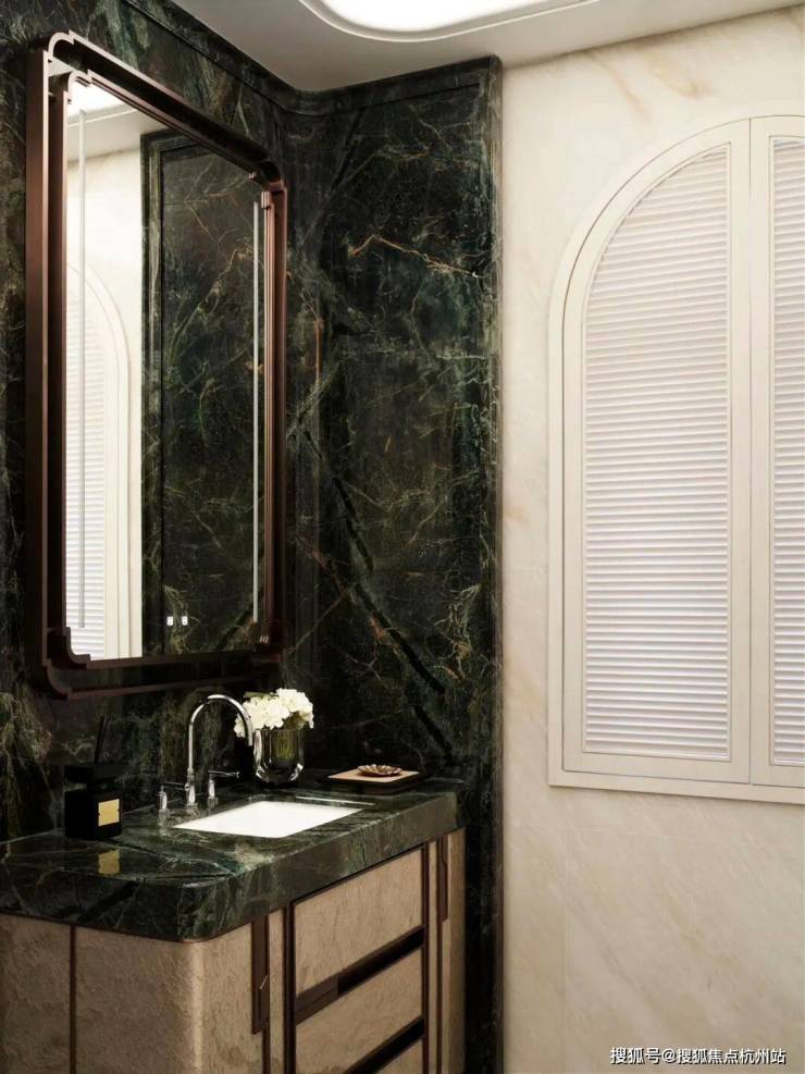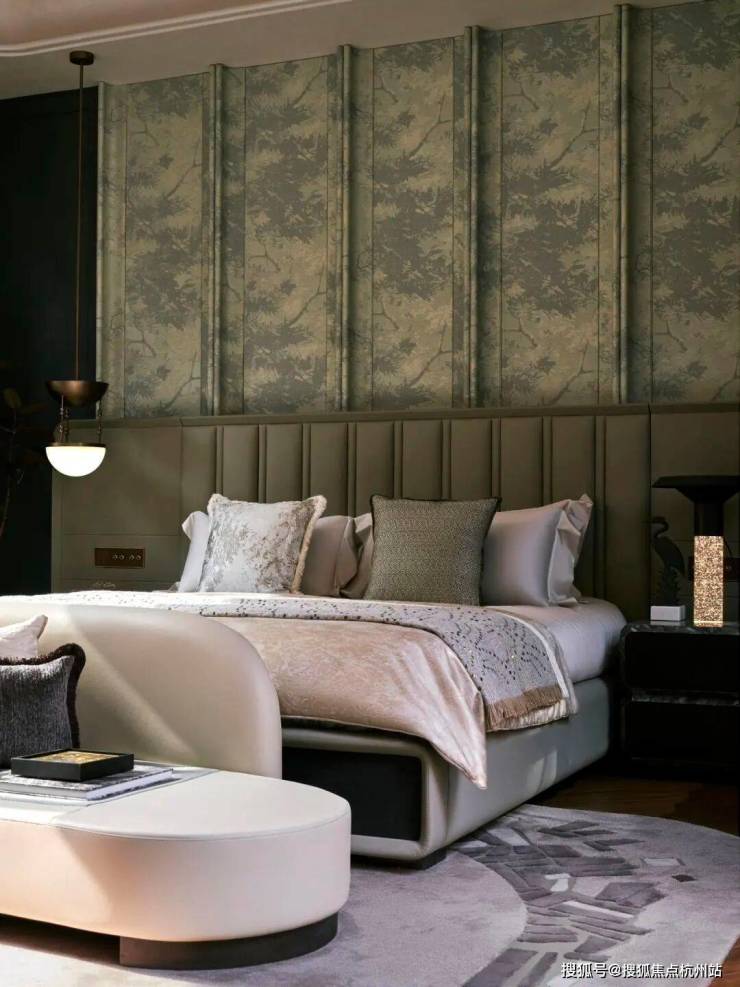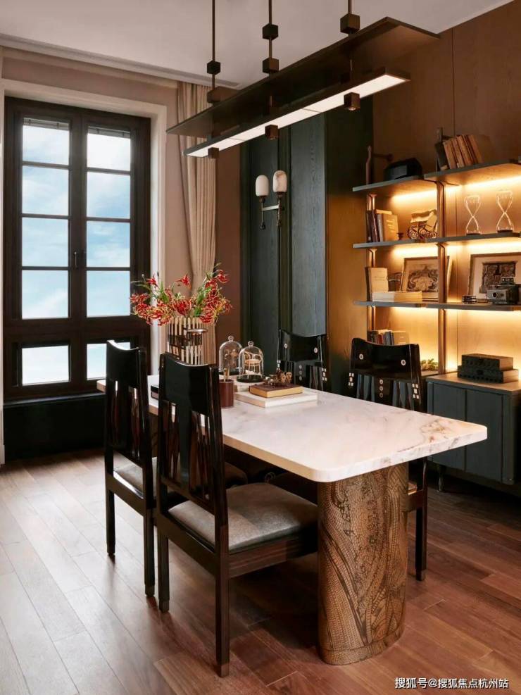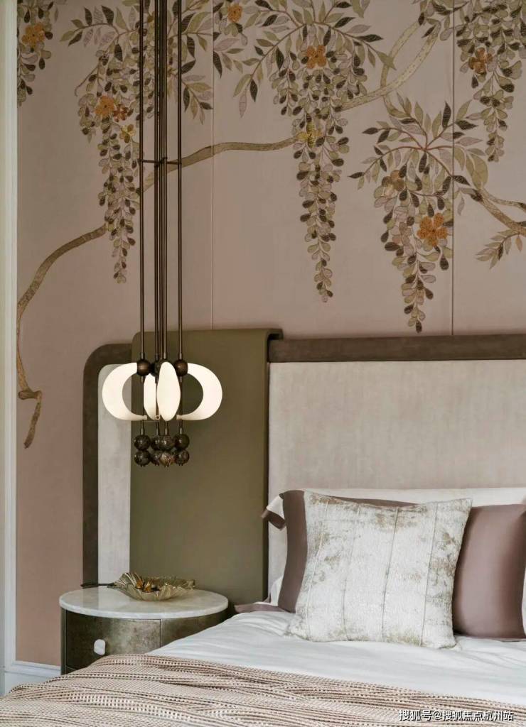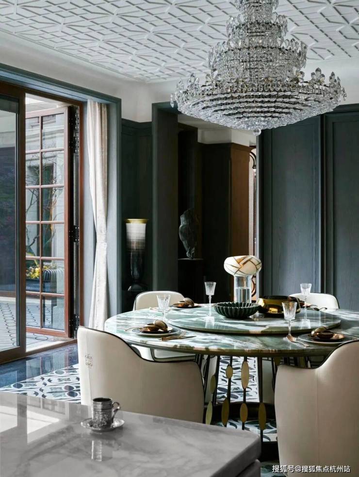 建筑面积约495㎡传家大宅,海派气质内外辉映;深色木饰面与柔和的刺绣主背景,框定空间层次格局,营造稳当厚重的氛围基调,法式留白的墙面与顶部造型,与原筑提取的典型拼花地砖相呼应,经典的精致与典雅,海派传家大宅的气度不言而明。