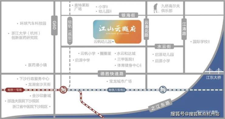 交通地铁:直线 2km 内有 33 个公交站点,如 “水云街文淙北路口”“云涛北路银海街口” 等。项目距规划中的下沙至长安地铁银海街站仅 100 米,1/8 号线文海南路站距项目约 2.5 公里,临近 4 大过江通道、2 条快速路及绕城高速,自驾出行便捷。