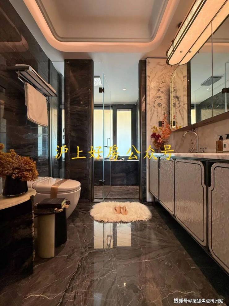 电视背景墙选用意大利超白洞石材;卫生间台面及墙面采用芬迪白;来自巴西进口的静雅棕石材在有些顶豪中仅用于卫生间点缀,而在绿城黄浦ONE,则将其大量运用于地面铺装