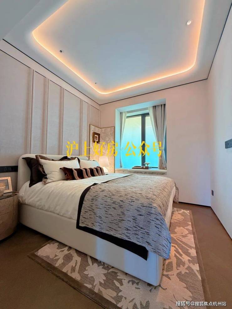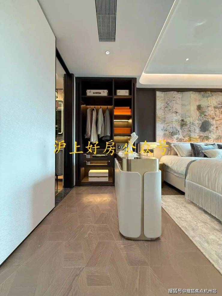 这可能是我见过弧形元素最多的样板间,吊顶、客厅墙面及卧室背景墙均采用大量曲面处理,涵盖木饰面与奢石等多种材质弧形工艺,即便工序复杂且成本高昂,但绿城仍坚持落实,只为业主更高级的使用体验