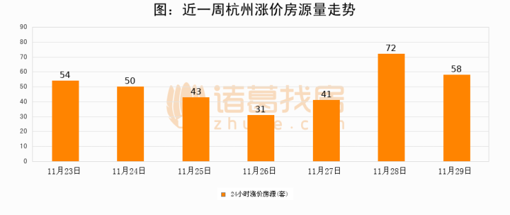 根据诸葛找房数据显示,杭州24小时涨价房源量为58套,较11月28日减少14套,环比下降19.4%。与此同时,涨价房源占比小幅回落,对于购房者来说是一个入市窗口期,购房者可抓住时机入市。