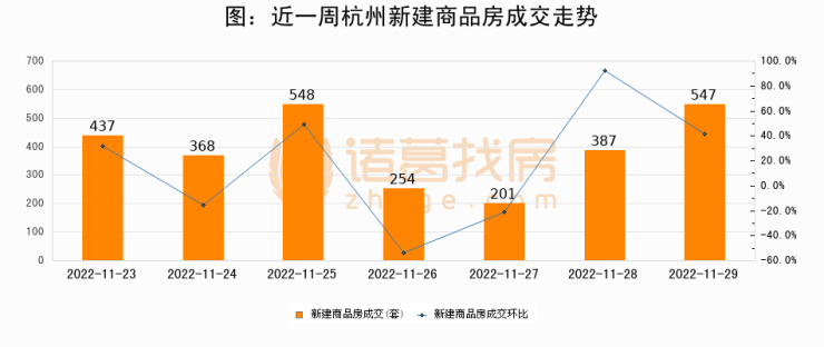 根据杭州市住房保障和房产管理局数据显示,2022年11月29日杭州新建商品房成交547套,较昨日增加160套,环比上涨41.3%