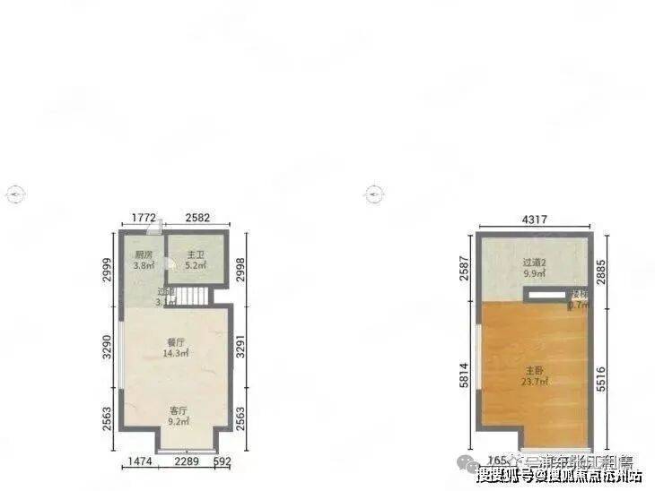 卫生间:1个卫生间设计,布局紧凑。厨房:开放式厨房,油烟恐干扰客厅。。 其他:4.5米挑高,买一层享2层。。 客厅:客厅朝被,带阳台,采光不错。。