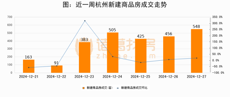 根据杭州市住房保障和房产管理局数据显示,2024年12月27日杭州新建商品房成交548套,较昨日增加92套,环比上涨20.2%