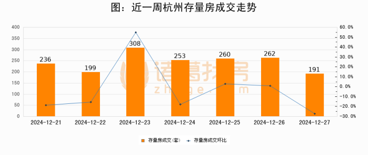 从存量房来看,2024年12月27日杭州存量房单日成交191套,比昨日减少71套,环比下降27.1%。从近一周存量房成交来看,杭州存量房日均成交套数为244套,12月27日单日成交191套,低于近一周平均水平21.7%。